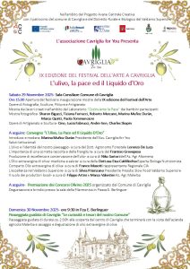 Domenica 30 novembre, alle 9.30, il Festival si sposterà all’aperto con una passeggiata guidata dalla piazza principale del paese, che terminerà presso l’azienda agricola Malerba con una piccola degustazione di olio.