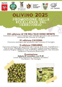 La giornata proseguirà presso la sala della Filarmonica in piazza Enrico Berlinguer con la premiazione del concorso Olivino 2025, promossa dal Comune di Cavriglia, e si concluderà con un assaggio di olio extravergine di oliva e un brindisi con i vini locali.