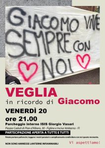 Venerdì sera, il cortile dell’Istituto “Giorgio Vasari” di Figline Valdarno ospiterà una fiaccolata in memoria di Giacomo, il giovane studente di 17 anni tragicamente scomparso la scorsa settimana in un incidente stradale. Un momento di raccoglimento per ricordarlo e per stare vicino alla sua famiglia e ai compagni di scuola.