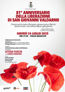 Il 24 e 25 luglio San Giovanni Valdarno celebra l’81° anniversario della Liberazione con una cerimonia istituzionale, un concerto di Letizia Fuochi e la tradizionale Pastasciutta antifascista. Era il 24 luglio 1944 quando le truppe alleate, con il supporto dei partigiani, liberarono San Giovanni Valdarno dall’occupazione nazifascista. A distanza di 81 anni, la città rinnova il proprio impegno nella memoria e lo fa con due giornate dense di significato, tra parole, musica e partecipazione popolare.