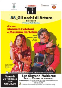 Venerdì 20 febbraio alle 21:30 al Cinema Teatro Masaccio di San Giovanni Valdarno va in scena “88_Gli occhi di Arturo”, lo spettacolo de I Bartolini TdC – Teatro di compagnia, promosso dal Comune di San Giovanni Valdarno. Parte del ricavato della serata sarà devoluto alla Confraternita della Misericordia di San Giovanni Valdarno, a sostegno delle attività di assistenza sul territorio.