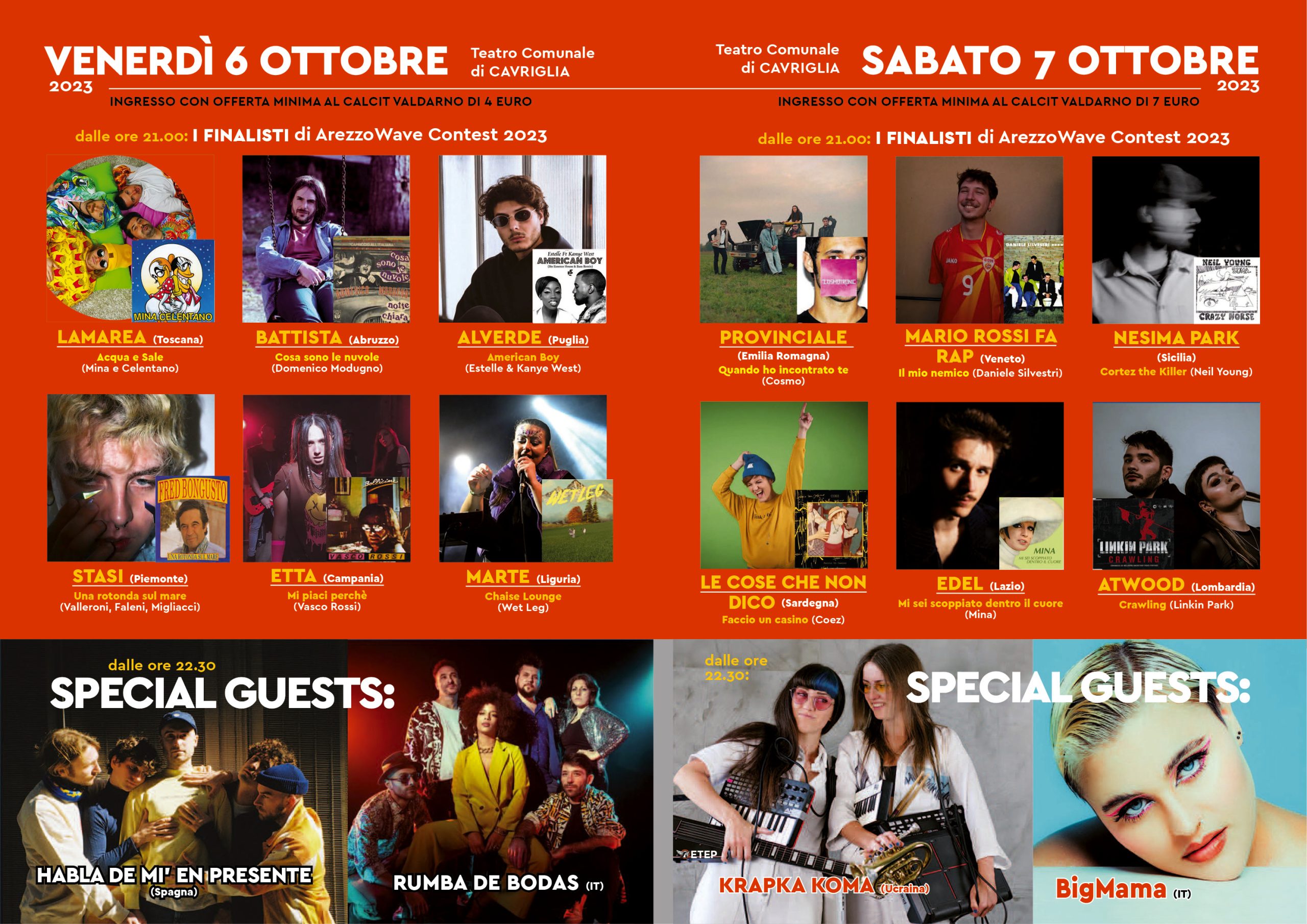 Mauro Valenti, Arezzo Wave :”È con enorme piacere che l’araba fenice di ArezzoWave si trova a volare anche quest’anno con nuovi stimoli e con un festival che cresce rispetto all’edizione 2022, per artisti stranieri ed italiani ospiti e campi nuovi che si aprono per il nostro pubblico. Quest’anno, come leggete, sarà un’edizione più grande e più completa, ma vorrei sottolineare particolari per noi importanti anche se meno eclatanti. Nello staff e negli incontri vedrete molti giovanissimi, molti del Valdarno (dal Liceo Artistico di Montevarchi), altri di Arezzo e altri ancora da Perugia e altre parti d’Italia. Ci piaceva far conoscere come si realizza un evento, dare responsabilità e gratificazioni e magari futuri posti di lavoro nel settore dello spettacolo. Inoltre il ricavato delle offerte di entrata per le nostre iniziative, ad Arezzo come nel Valdarno, va al Calcit, ente meritorio per le finalità e gli obiettivi che ogni anno persegue e raggiunge.”
