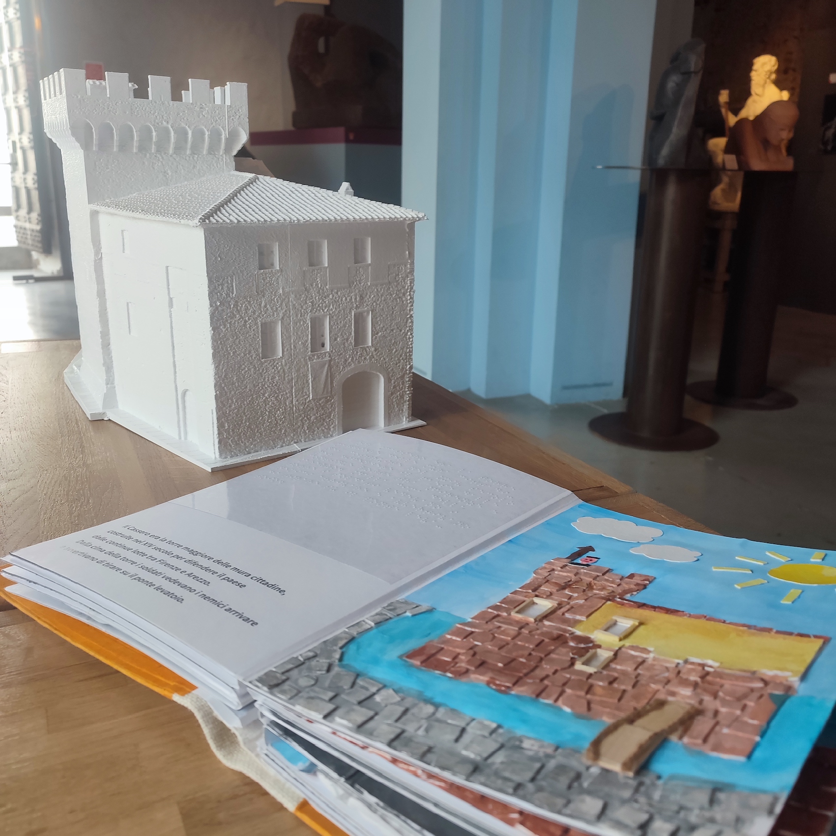 La postazione multisensoriale, collocata all’ingresso del Museo Civico di Montevarchi, unisce un modello tridimensionale dell’edificio – realizzato grazie alla sponsorizzazione tecnica di Maker House, azienda del Valdarno Superiore fondata nel 2018 da un imprenditore sensibile ai temi dell’accessibilità – a un libro tattile costruito dagli studenti e a contenuti accessibili come audiodescrizioni e video in LIS, fruibili tramite QR code. Il progetto ha rappresentato un’importante occasione di crescita per l’intero gruppo classe, chiamato a confrontarsi con i temi dell’accessibilità e della complessità dei bisogni delle persone con disabilità visiva. Il Totem si è inserito in un più ampio programma di accessibilità sviluppato dal Cassero in collaborazione con il Museo Tattile Statale Omero e con l’Ente Nazionale per la Protezione e l’Assistenza dei Sordi, che comprende audiodescrizioni e video in Lingua dei Segni Italiana e integra un percorso tattile già strutturato all’interno del museo.
