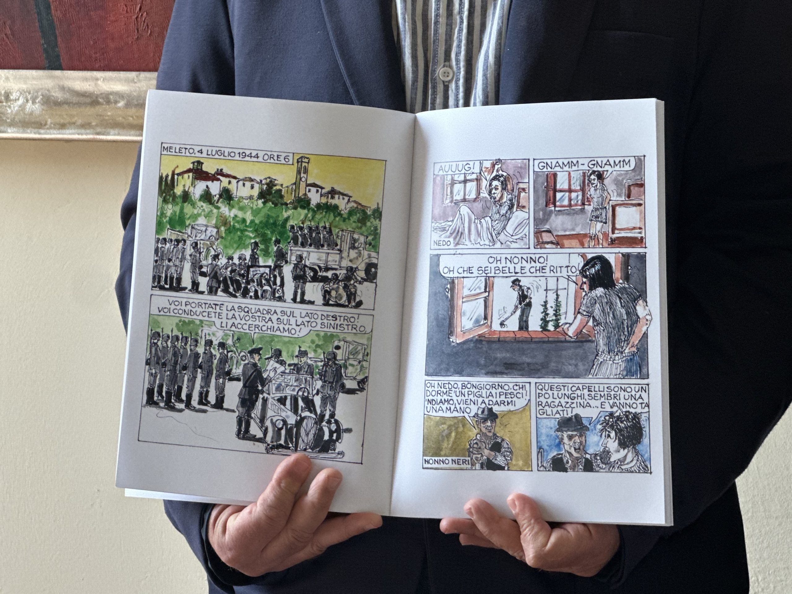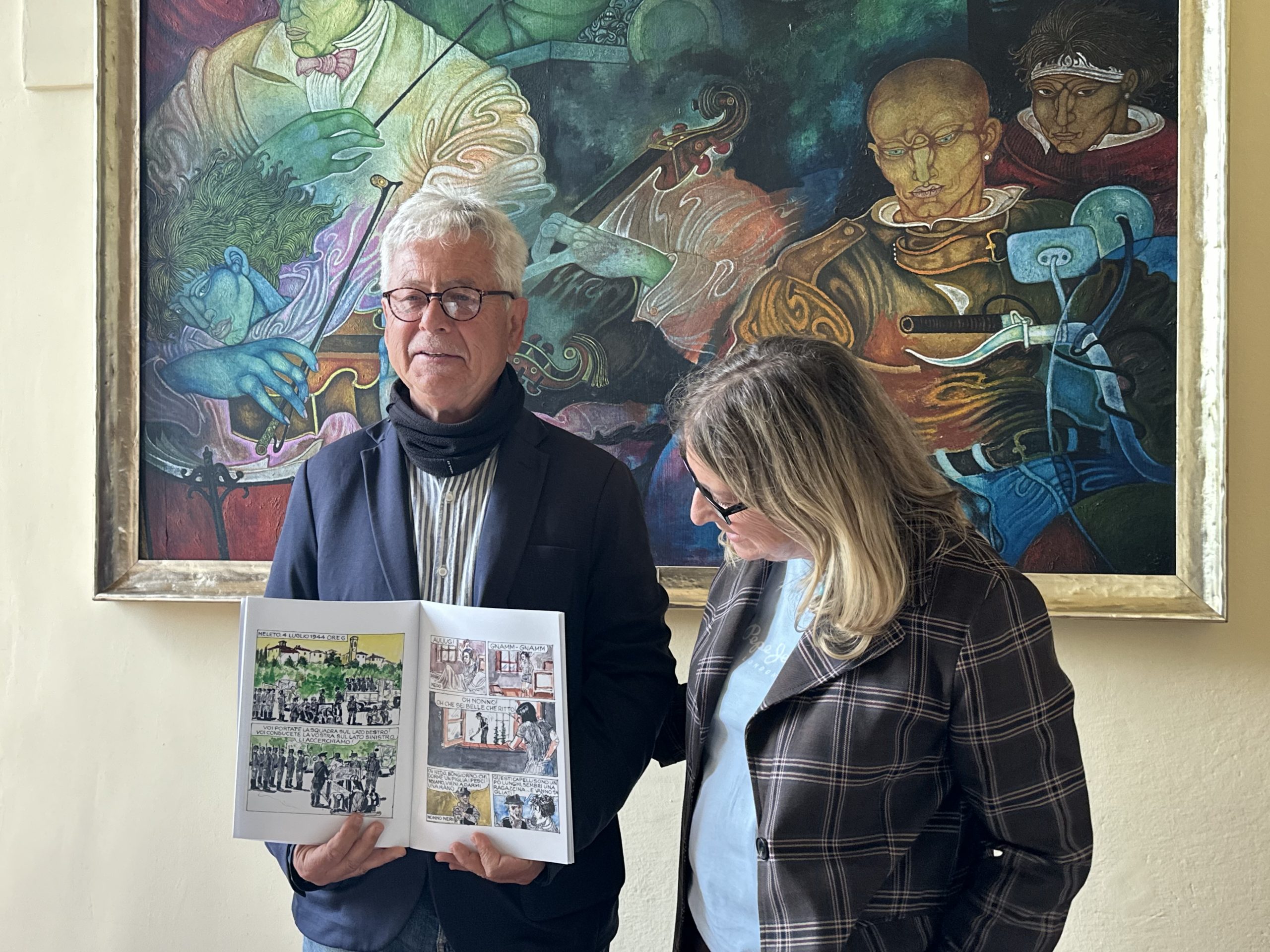 Pio Secciani, curatore del volume: “Questo progetto è nato diverso tempo fa e finalmente siamo arrivati adesso alla conclusione, il 30 di aprile alle ore 17:30 lo presenteremo alla popolazione. È nato perché nel corso degli anni, abbiamo fatto dei concorsi letterari e in uno di questi, è arrivato un racconto che racconta proprio la giornata del 4 luglio a Meleto. Per cui abbiamo pensato di trasformare questo racconto in un fumetto, e questo grazie a Biffe, per poterlo dare poi agli studenti delle scuole perché riteniamo questo un sistema moderno per comunicare con loro. Vogliamo così tramandare la memoria di questa tragica strage di ben 93 civili, che poi furono ovviamente uccisi, bruciati e molti dei quali addirittura non erano più nemmeno riconoscibili da come erano stati ridotti dal fuoco.