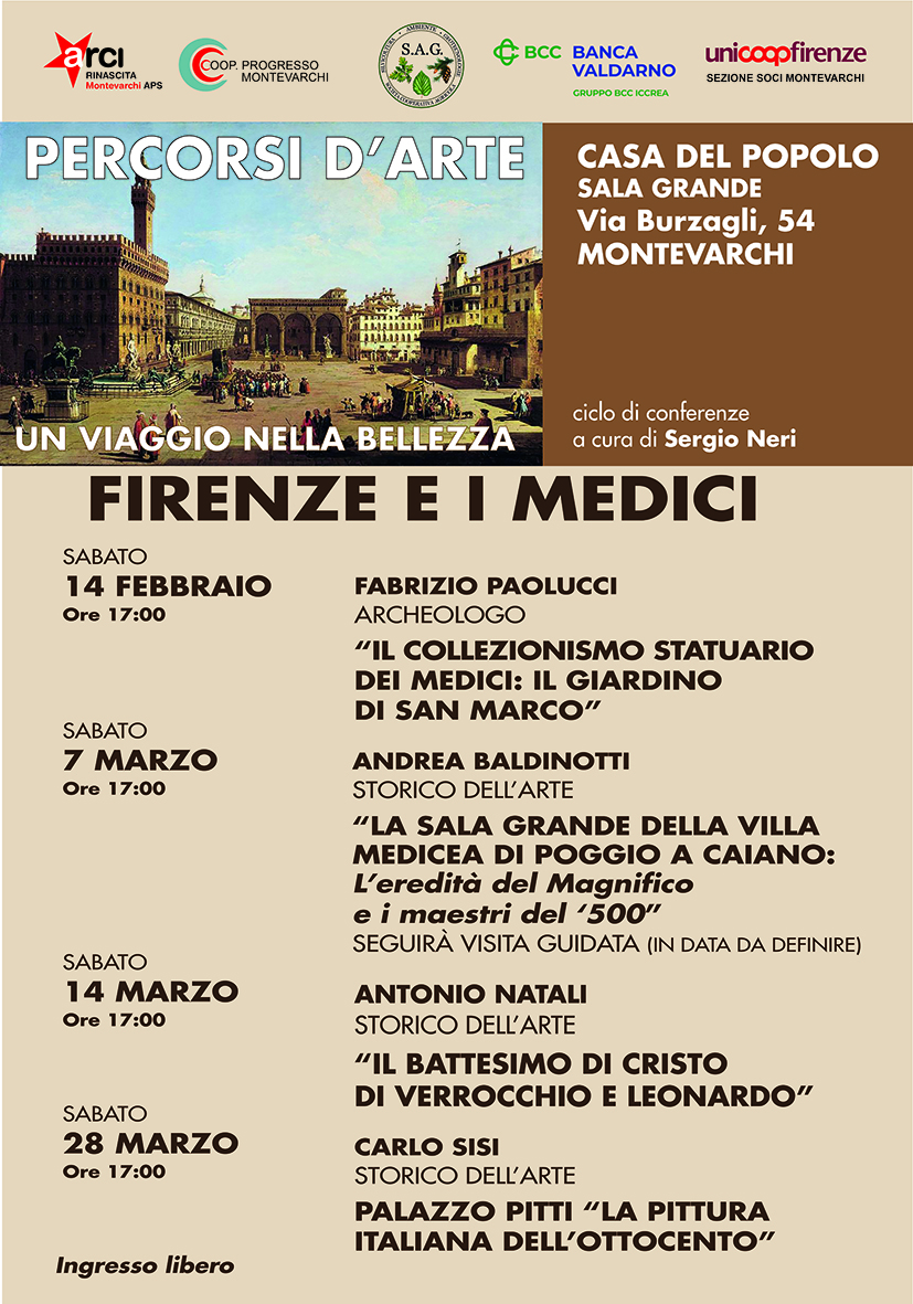 Gli appuntamenti riprenderanno poi dal 7 marzo con tre conferenze ed una visita guidata. Gli organizzatori ringraziano per il sostegno Unicoop Firenze Sezione Soci di Montevarchi, Banca del Valdarno e S.A.G. Società Cooperativa Agricola per la sensibilità dimostrata anche in questa occasione, sostenendo questo progetto sull’arte ormai diventato centrale nell’offerta culturale del territorio.