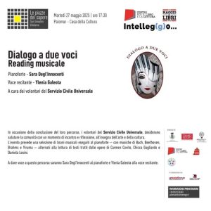 Martedì 27 maggio, alle 17.30, è in programma il reading musicale “Dialogo a due voci”, un originale intreccio tra letteratura e musica curato dai volontari del Servizio Civile Universale. La voce narrante sarà quella di Ylenia Galeota, accompagnata al pianoforte da Sara degl’Innocenti. L’evento propone un percorso emozionante che unisce brani musicali di Bach, Beethoven, Brahms e Yiruma a letture tratte dalle opere di Carmen Covito, Chicca Gagliardo e Daniela Losini.