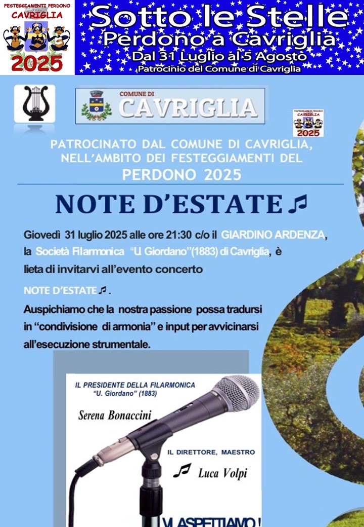 Il programma musicale prenderà il via giovedì 31 luglio con il concerto “Note d’estate” della Filarmonica “U. Giordano” di Cavriglia al Giardino Ardenza. Le serate successive saranno animate da eventi dedicati al ballo e alla musica live. Tra gli appuntamenti più attesi, il concerto dei Killer Queen sabato 2 agosto alle 22, la serata discoteca a cura di “Fitzcarraldo Showcase” domenica 3 agosto dalle 23, e lo spettacolo degli Stranobakkano che chiuderanno i festeggiamenti martedì 5 agosto alle 21.30, poco prima dello spettacolo pirotecnico.