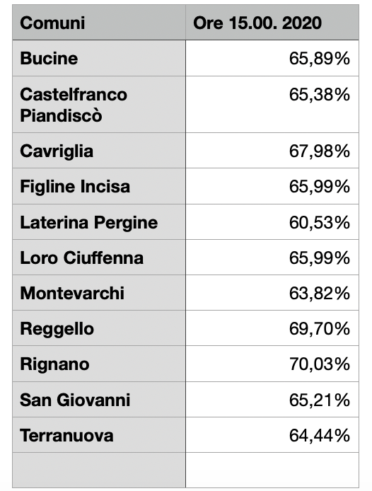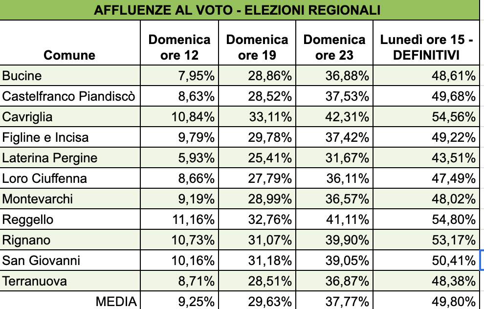 Soltanto San Giovanni, Cavriglia, Reggello e Rignano superano il 50% dei votanti.
