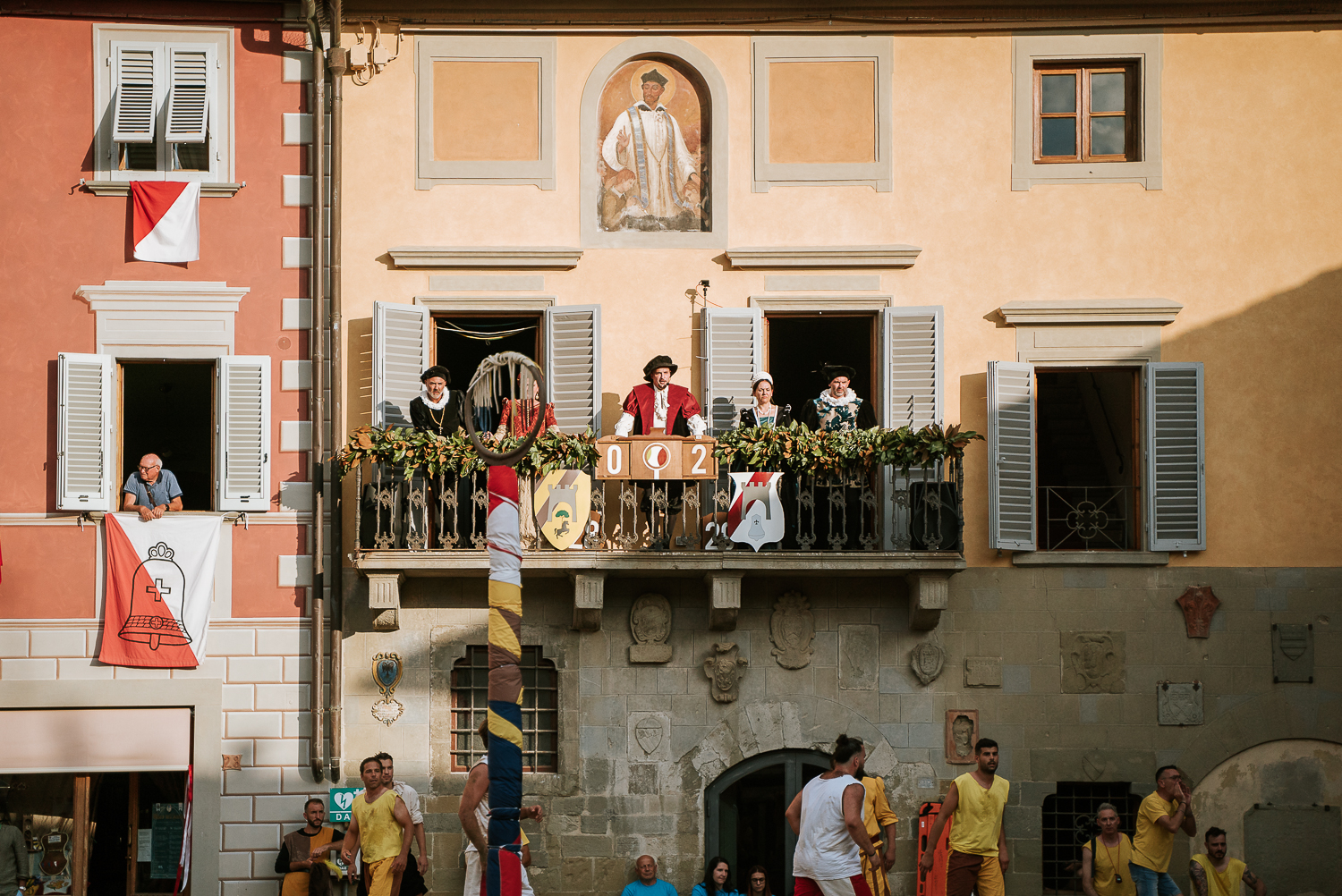 Michele Rossi, sindaco di Castelfranco Piandisco’: “Una bellissima tradizione che questa amministrazione comunale ha deciso di sposare a 360 gradi e siamo veramente contenti e orgogliosi di poter ospitare il Gioco dell’Anello. Questi ragazzi del comitato sono stati straordinari, stanno lavorando da un anno intero alla realizzazione di questo evento, con il supporto dell’Amministrazione comunale, affinché sia sempre più bello e coinvolga sempre un maggior numero di persone. È un modo bellissimo di far vivere il nostro territorio, anche da un punto di vista economico, di rilancio, per le attività produttive. È un modo per far vivere anche ai turisti e anche a tutte le altre persone del Valdarno tre giorni importanti. L’11, il 12 e il 13 di luglio, sono anche un modo per far vivere la nostra piazza, perché la nostra piazza trecentesca così bella si tinge anche di storico, di folcloristico e poi è  bellissimo perché vedere tutto il paese che insieme sostiene questo gioco, è un’emozione veramente unica. Tra l’altro alle cene propiziatorie che ci sono state qualche giorno fa, è stato veramente bellissimo vedere oltre seicento persone che mangiavano all’interno del nostro paese, nel centro storico di Castelfranco. È stata una cosa bellissima, ti dà proprio il senso della comunità e il senso che il gioco è sostenuto da tutto il paese di Castelfranco e quindi credo sia veramente una cosa importante da proseguire e da mantenere per il futuro”.