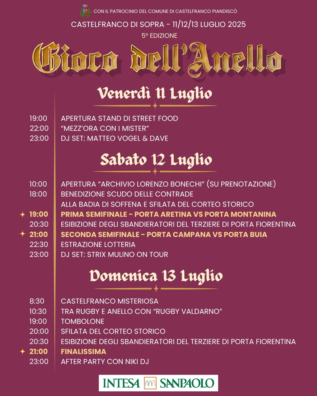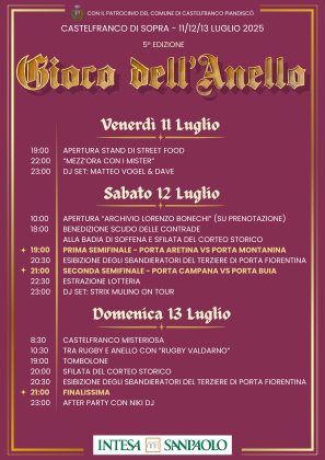 Il Gioco dell’anello si terrà da venerdì 11 a domenica 13 luglio con una serie di eventi che faranno da corollario alla competizione, tutti immersi nella splendida e suggestiva scenografia di un passato glorioso e fastoso di Castelfranco.