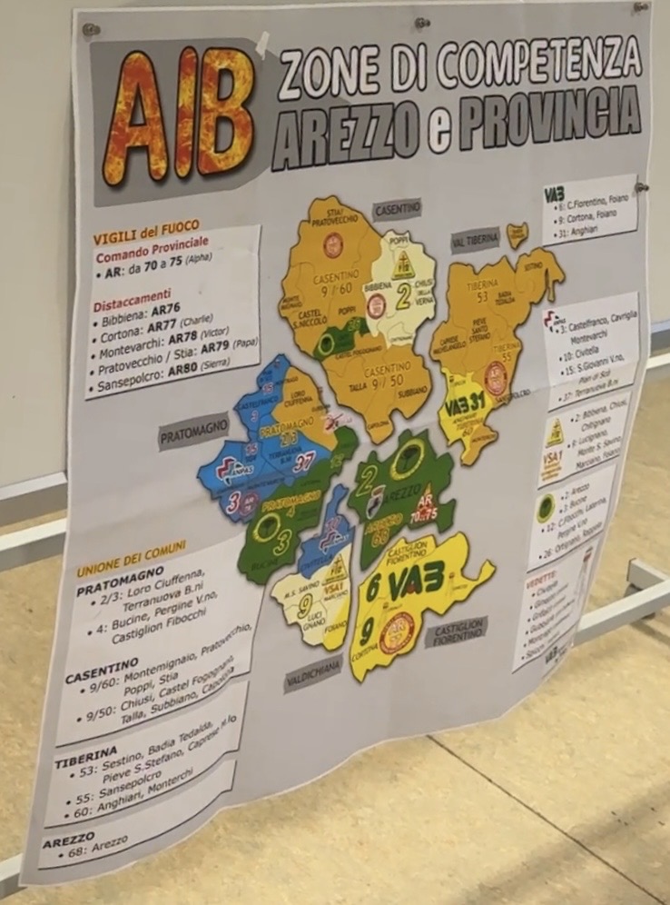 La lotta attiva agli incendi boschivi in Toscana è coordinata dalla Sala Operativa Unificata Permanente (SOUP) e dai sei Centri Operativi Provinciali (COP) AIB. Per la provincia di Arezzo, dal 2016, il COP ha sede presso l’Unione dei Comuni del Pratomagno.
