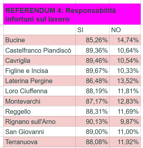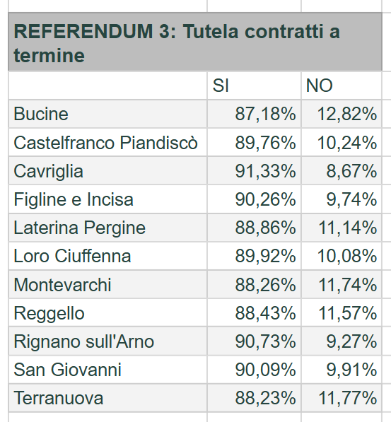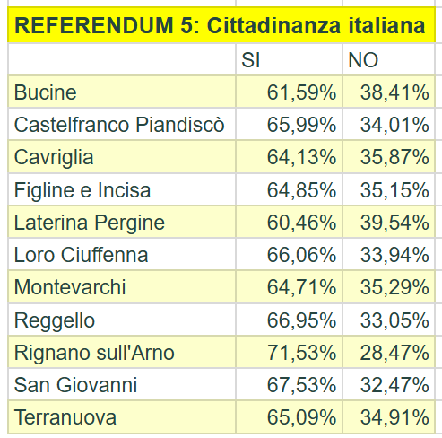 Sono andati per la maggioranza al ‘Sì’ i voti di chi ha scelto di recarsi alle urne in Valdarno. Anche qui, però, c’è una differenza sostanziale fra i quesiti che riguardano il lavoro, e quello invece relativo alla cittadinanza, che ha ricevuto molti meno consensi e più scelte per il ‘No’.