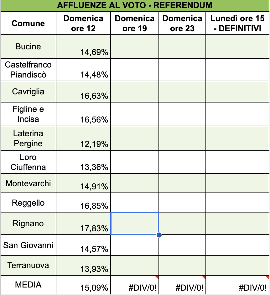 Alle 12.00 in Valdarno ha votato il   15,09% degli aventi diritto.
