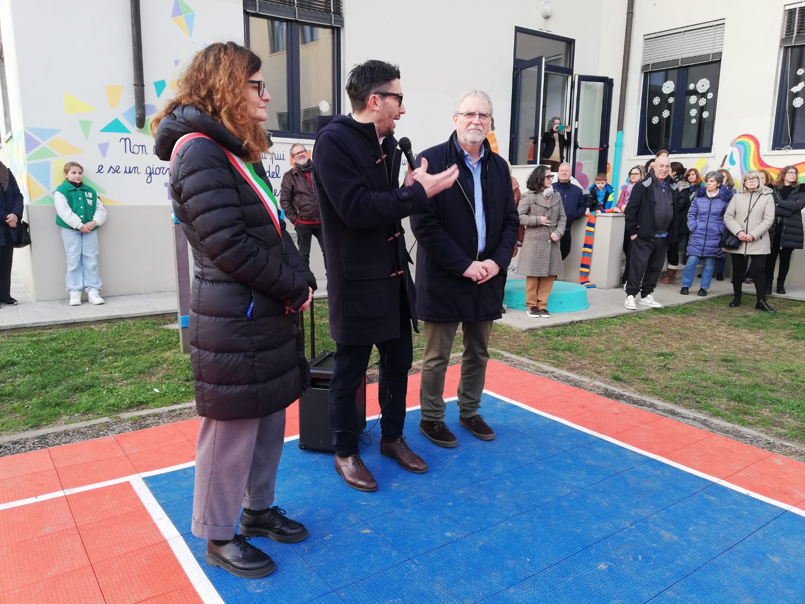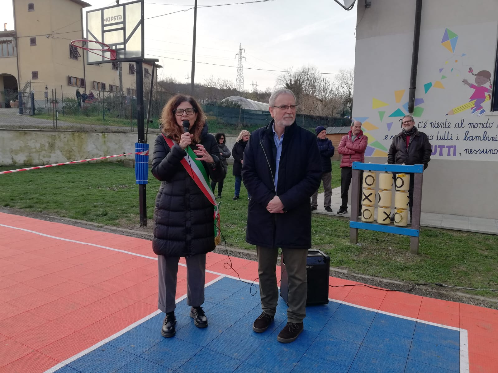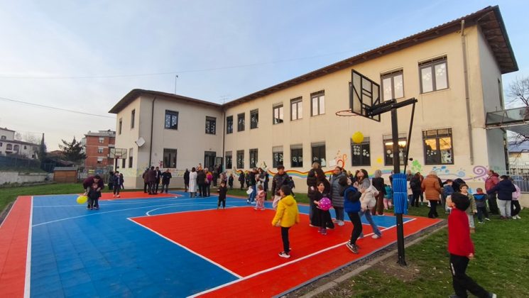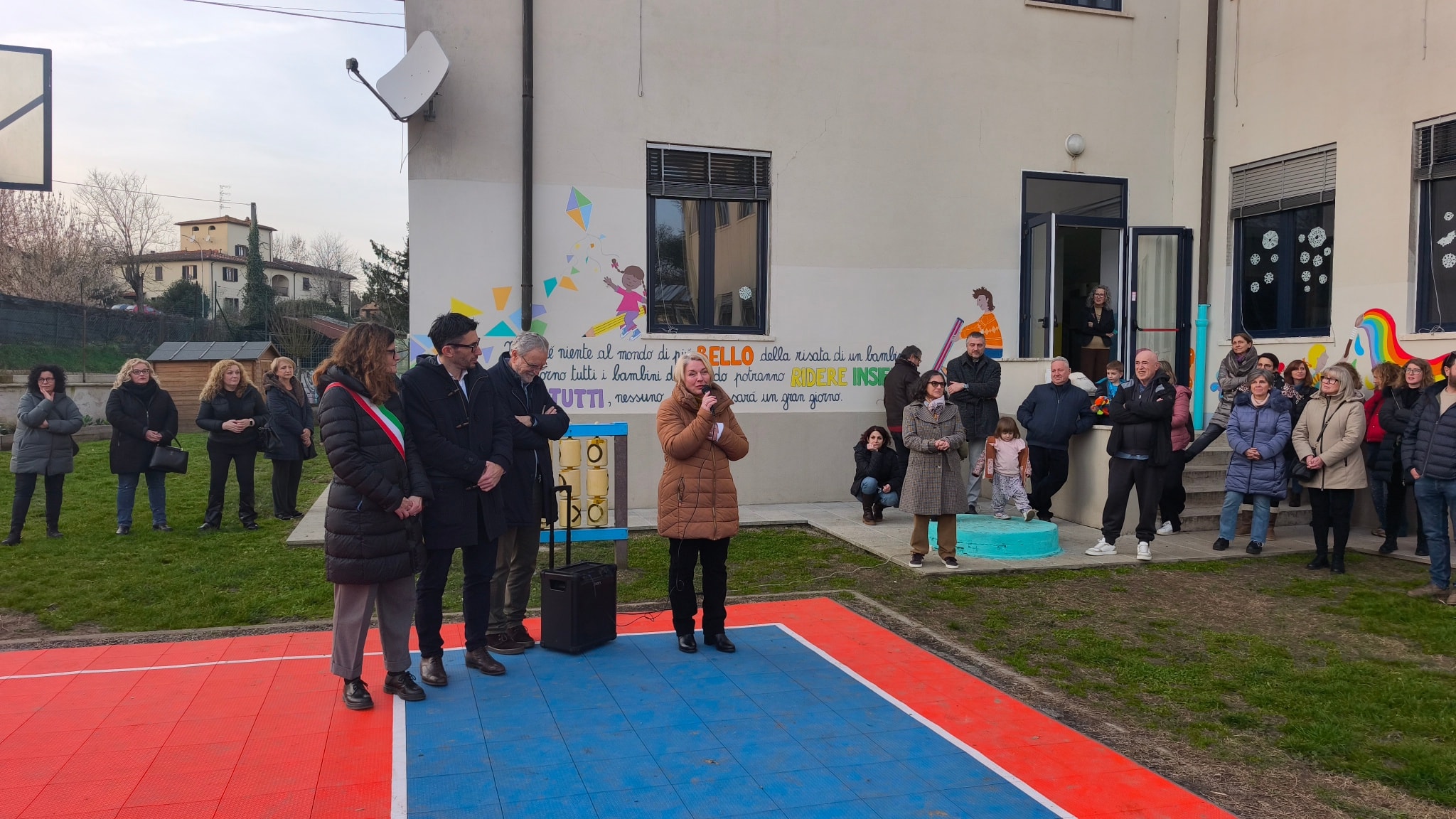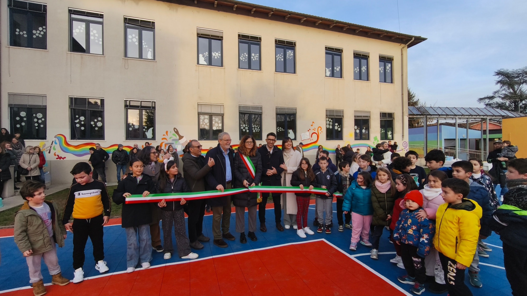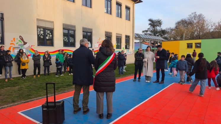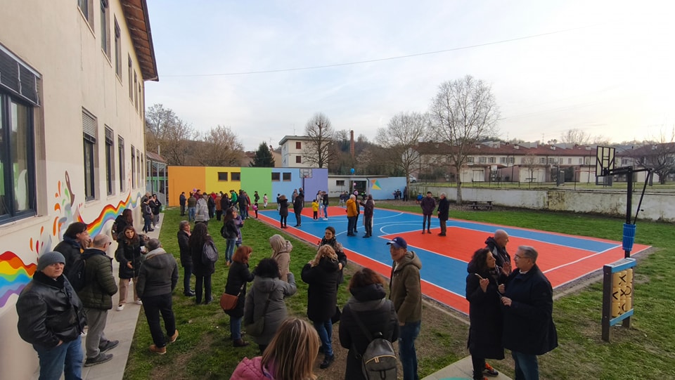 Studenti, docenti, famiglie presenti in gran numero questo pomeriggio a San Giovanni al taglio del nastro per il nuovo campo da basket e per il murales presso la scuola primaria Gianni Rodari di Ponte alle Forche. Un intervento che ha restituito alla comunità scolastica spazi rinnovati, funzionali e ricchi di colore.