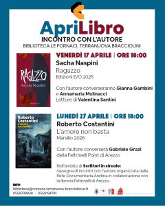 Il secondo appuntamento è in calendario per lunedì 27 aprile, ancora alle 18, quando la biblioteca ospiterà Roberto Costantini. L’autore porterà al pubblico il suo nuovo libro, L’amore non basta, edito da Marsilio, in un incontro che intreccerà racconto, tensione psicologica e approfondimento sui personaggi. A dialogare con lui sarà Gabriele Grazi della Feltrinelli Point di Arezzo.