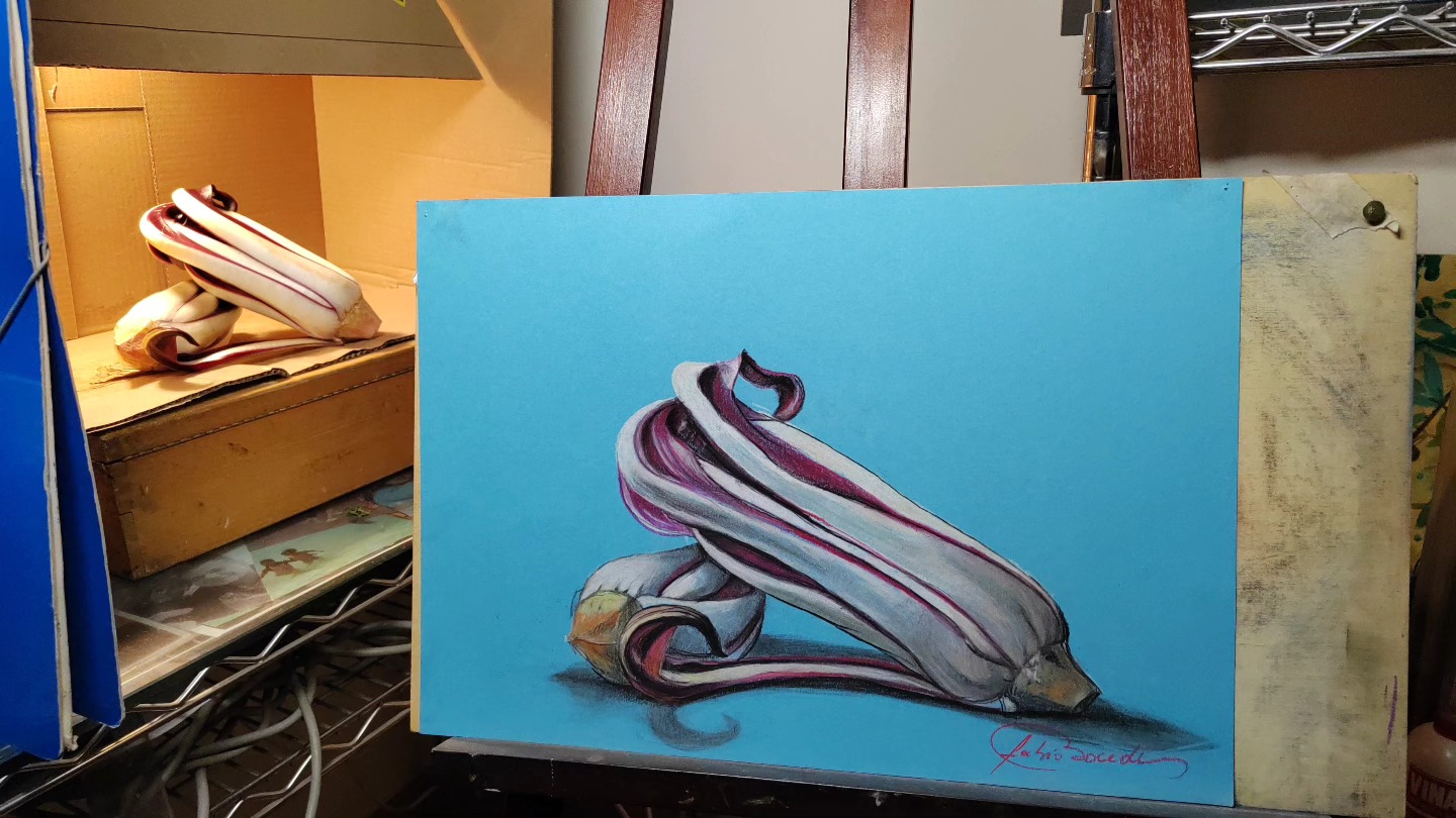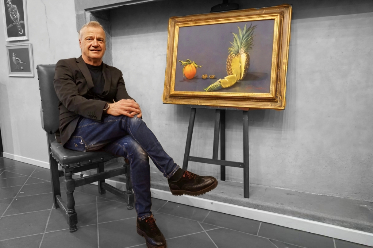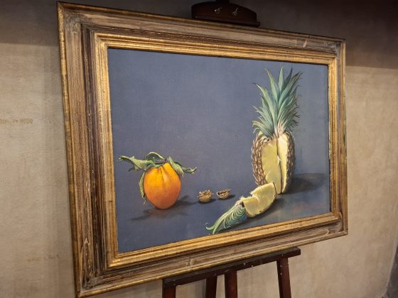 Quando ha iniziato davvero a dedicarsi alla pittura in maniera seria? “Due anni fa ho finito la mia esperienza lavorativa, sono andato in pensione e quindi avendo più tempo a disposizione ho scelto di usare questo tempo prezioso per riprendere in mano questa mia grandissima passione. Mi sono organizzato in casa, ho ricreato un piccolo ambiente e dove io poi monto questi disegni e faccio, a parte i volti, quelli no, perché non ho il soggetto di fronte, quindi mi devo affidare a dei disegni o delle foto. Ma la frutta, la verdura sono soggetti che si prestano bene a essere rappresentati perché a me mi serve molto studiare l’effetto della luce con lo scuro, con la tenebra”.