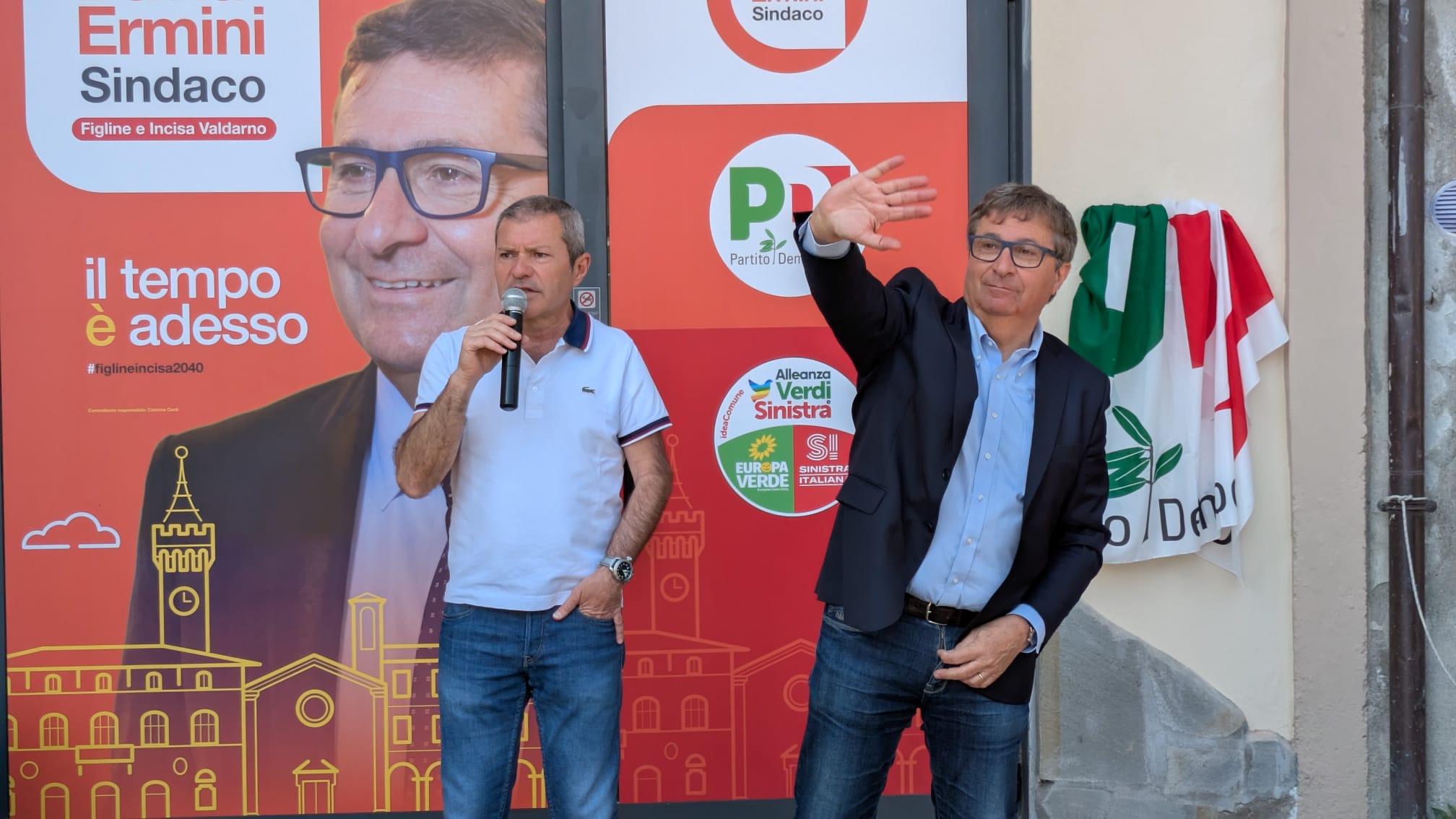 “Noi siamo un’alleanza, e lo dico, mi dispiace che non ci sia il Movimento 5 Stelle, perché gli amici di Figline del Movimento 5 Stelle sono impegnati tantissimo per esserci. E io li ringrazio per quello che hanno fatto, per quello che faranno, per quello che potremmo vedere anche loro. Però siamo una coalizione politica che ha voluto un candidato con un po’ di esperienza in altri luoghi, con altri incarichi anche prestigiosi, e che si mette insieme a voi tutti, alla squadra dei candidati consiglieri e delle liste che ci appoggiano, e a disposizione di questo Comune perché abbia veramente uno sviluppo sempre maggiore”.
