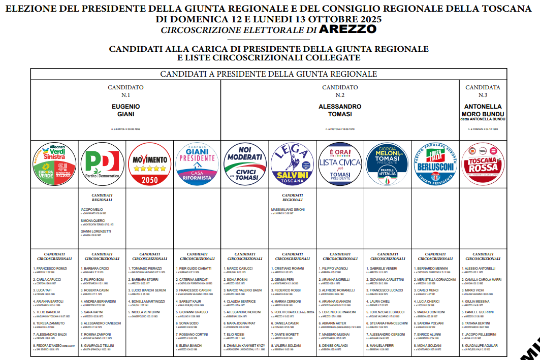 I cittadini del Valdarno aretino votano nel Collegio di Arezzo: qui il manifesto con i candidati delle liste.