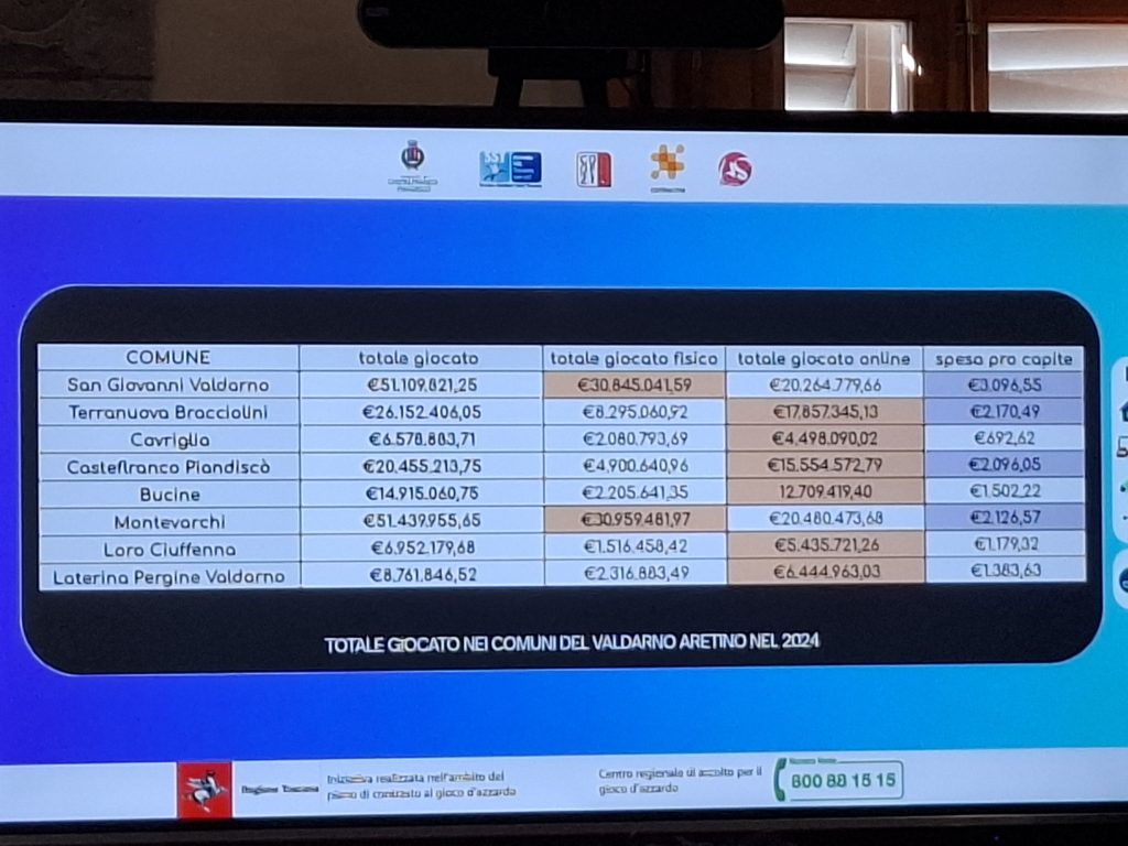 Più di 186 milioni di euro: è la somma che nel 2024 (dati più recenti disponibili) è finita nel gioco d’azzardo legale in Valdarno aretino. La spesa pro capite nei vari comuni è alta, arriva addirittura a 3mila euro a persona all’anno, contando dai neonati agli ultracentenari. Di questi soldi, circa la metà finisce nel gioco online, che sta diventando il più diffuso specialmente nelle fasce più giovani.