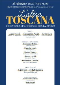 Questo sabato 28 giugno alle ore 9.30, preso l’Hilton Florence Metropole di Firenze, si terrà la presentazione del Manifesto programmatico de “L’altra Toscana”, un’iniziativa promossa da un’ampia rete di liste civiche e amministratori locali decisi a rilanciare una visione alternativa per il futuro della regione.