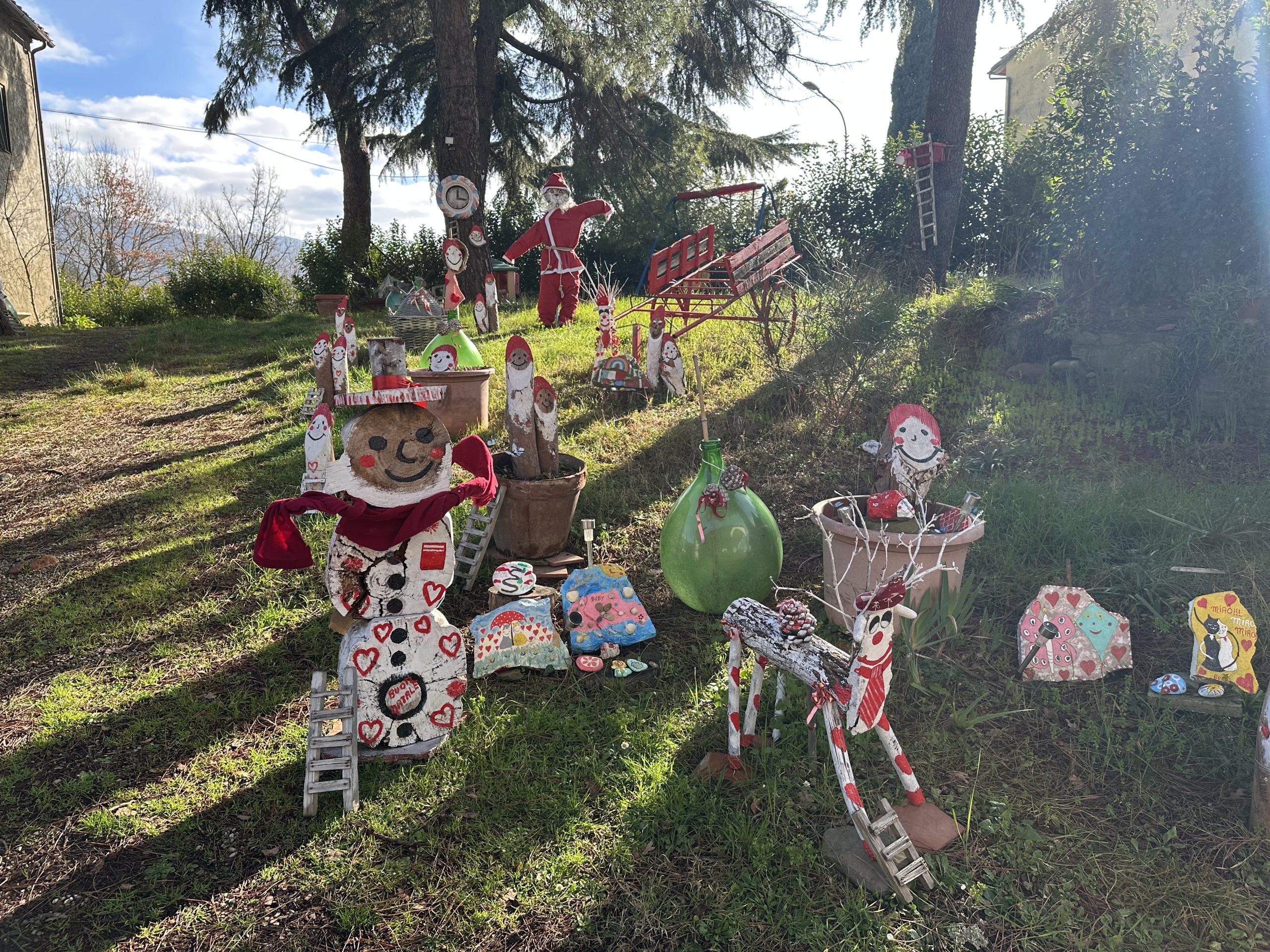 Daniela racconta che non ha un’ispirazione precisa, la sua arte nasce sul momento: “Mi vengono così, in modo spontaneo, ad esempio quando si avvicina il Natale, mi viene naturale fare le renne. Addirittura per le renne quando poi le misi fuori si fermò una macchina con marito e moglie. Sono piaciute talmente tanto che mi hanno chiesto se potevo preparargliene due da poter mettere nella vetrina del negozio della loro figlia per Natale. Sono piaciute molto, mi hanno mandato anche dei messaggi. Poi durante il periodo del Covid ho anche scritto un libro e ora, insieme alle mie figlie, stiamo pensando di pubblicarlo. Parla della mia infanzia. Mi piace molto anche scrivere. Ho persino scritto una canzone, che mi piace, anche se sta lì nel cassetto. La sera verso la mezzanotte mi venne questa ispirazione e così è nata questa canzoncina bellina estiva, orecchiabile.”