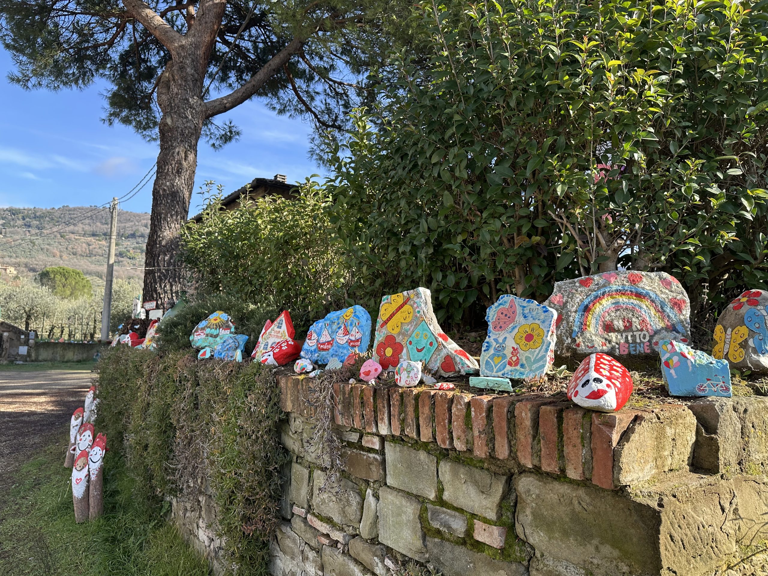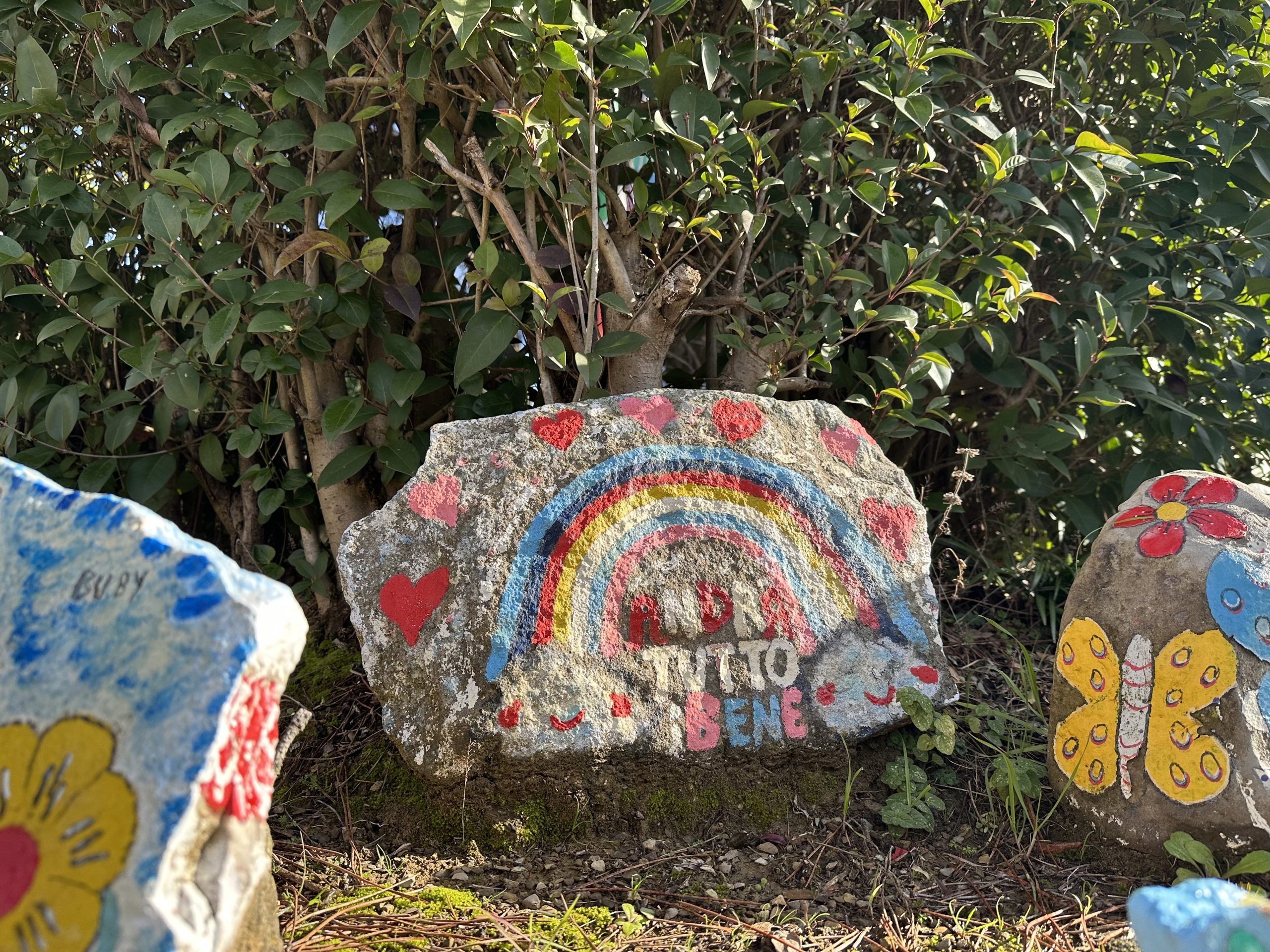 La prima opera che ha realizzato è proprio una pietra dedicata al periodo del Covid: “È nata durante il Covid, in un periodo in cui si parlava tanto di pace. Per questo ho realizzato un sasso con l’arcobaleno. Un giorno è venuto un ragazzo a portare le mascherine e il sasso lo avevo quasi completato e messo in fondo alle scale. Quando lo ha visto mi ha chiesto se poteva fargli una foto ed io ho accettato. Mi ha poi chiesto se lo avessi fatto io e quando gli ho detto di si mi ha risposto che gli piaceva tantissimo. Ha fatto la foto al sasso e poi mi ha chiesto “Posso fare una foto anche a lei?”. Gli ho detto di sì, senza problemi. Quel sasso è nato proprio in quel periodo lì, durante il Covid, perché si respirava un’aria diversa: si doveva stare tutti in casa e ci si sentiva un po’ più buoni, più bravi.»